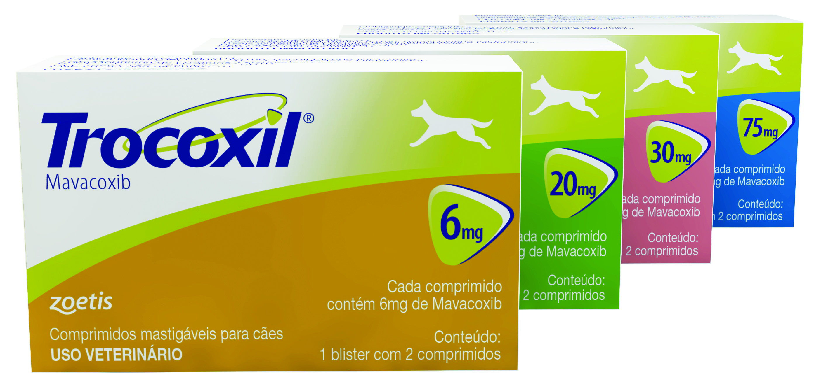 Trocoxil® está disponível em comprimidos mastigáveis (6 mg, 20 mg, 30 mg e 75 mg) para uso oral.
