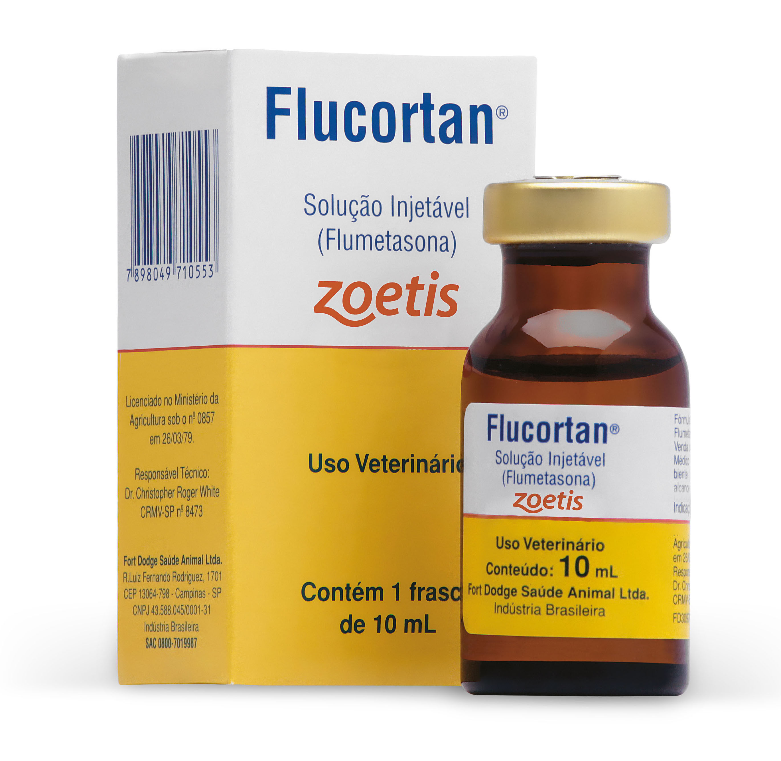 Flucortan®Zoetis Indústria de Produtos Veterinários Ltda. Flucortan® é uma solução injetável de flumetasona 0,5 mg/mL para aplicação por qualquer via parenteral, indicada para todos os casos em que se recomende uma adrenocorticoterapia, tais como: terapia de suporte (associado a antibacteriano) nas infecções bacterianas, nas inflamações, incluindo condições musculoesqueléticas, nos estados alérgicos; nas cetoses. |