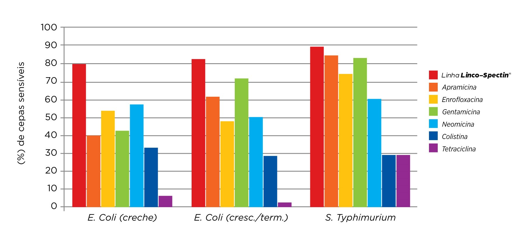 Observe como os principais agentes causadores de diarreia nos suínos apresentam elevada sensibilidade aos produtos da linha Linco-Spectin®.