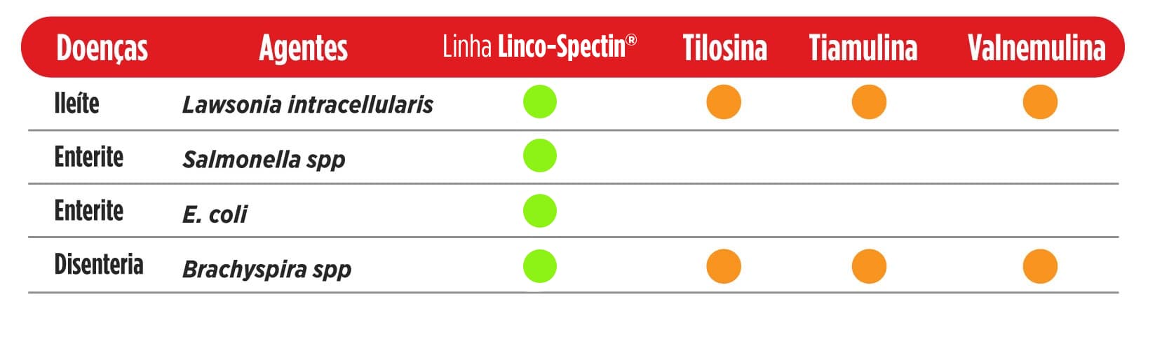 - Controle e tratamento de enterites que cursam com a disenteria suína (Brachyspira hyodysenteriae), colite (Brachyspira pilosicoli), ileíte/enteropatia proliferativa suína (Lawsonia intracellularis), colibacilose (Escherichia coli), salmonelose (Salmonella spp).