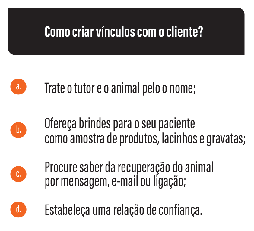 Procure, em todos os estágios do relacionamento com o cliente, criar vínculos com ele. Confira o infográfico abaixo com algumas atitudes que você pode aplicar no dia a dia da sua clínica e que fazem muita diferença no faturamento: