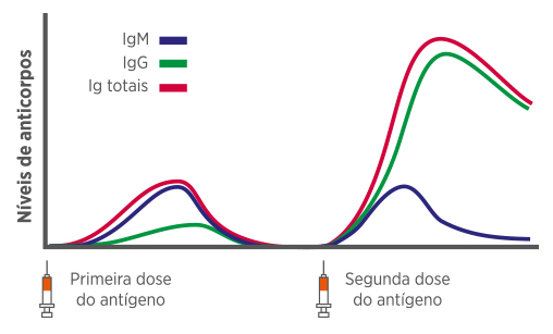 Na fase de imunização, em que ocorre a segunda exposição ao mesmo antígeno, verifica-se um desvio ou alteração de classe na produção de anticorpos. Essa fase, considerada uma resposta secundária, caracteriza-se pela produção de imunoglobulinas do tipo G (IgG) ou, dependendo da situação, IgA e IgE. A IgG é o anticorpo predominante no plasma e também o de maior meia-vida. A IgG responde pelos fenômenos de opsonização e neutralização de antígenos, sendo também envolvida na citotoxicidade mediada por células dependente de anticorpos.