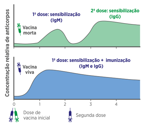Na ausência de anticorpos maternos (acima de 16 semanas de vida), 2 doses de uma vacina morta são necessárias para imunizar o animal, sendo que a primeira dose sensibilizará e a segunda efetivamente imunizará. A exceção clássica a essa regra é a vacinação contra a raiva, pois se sabe que uma única dose é suficiente para assegurar a proteção. No caso das vacinas vivas atenuadas, sem anticorpos maternos, em teoria apenas 1 dose é suficiente para sensibilizar e imunizar ao mesmo tempo.