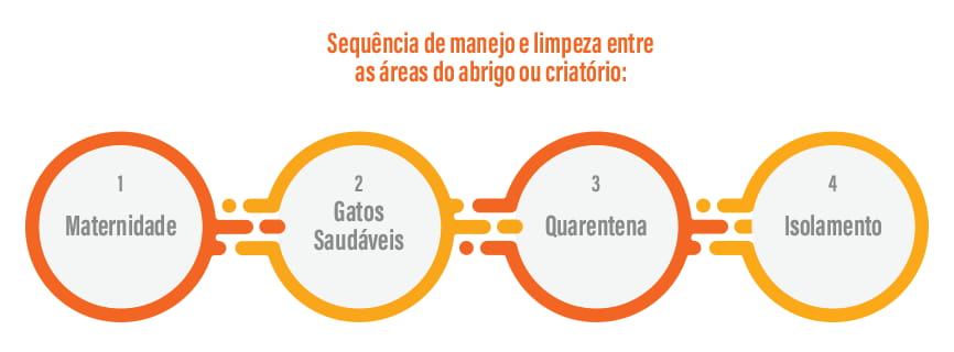 Em cada entrada dos diferentes recintos das áreas do abrigo ou criatório deve estar disponível um local para lavar as mãos, higienizar os calçados em pedilúvios e o uso de luvas. A cada entrada e saída dos recintos estes procedimentos de higiene devem ser adotados. As pessoas que trabalham no local devem usar uniformes ou roupas diferentes daquelas usadas quando chegaram da rua. Os materiais e equipamentos de limpeza, desinfecção e alimentação devem estar disponíveis em cada recinto e deixados exclusivamente nestes locais, sem permuta entre as áreas. Nas áreas de quarentena e isolamento estas medidas devem ser mais cuidadosas, realizadas na abordagem de cada gato individualmente e deve ser de acesso restrito.